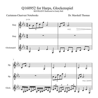 Harmonica,Percussion - Level 5 - Interactive Download SKU: A0.1245105 By Celebrity Chamber Players. By Marshall Thomas. This edition: Interactive Download. Children,Classical,Film/TV. 6 pages. Duration 33. Father Ambrose Press #3aLPcqhD0Z0sEoCYolYQgf. Published by Father Ambrose Press (A0.1245105). Key: Eb major.A beloved, brief confection that prompted my friend, fellow-composer, Daniel Pinkham, to say "You should stop re-shaping your works to fit academia and strike out on your own." A work filled with Restraints. This product was created by a member of ArrangeMe, Hal Leonard’s global self-publishing community of independent composers, arrangers, and songwriters. ArrangeMe allows for the publication of unique arrangements of both popular titles and original compositions from a wide variety of voices and backgrounds. About Interactive Downloads Interactive Downloads are dynamic sheet music files that can be viewed and altered directly in My Digital Library from any device. Interactive features include: playback, tempo control, transposition, melody instrument selection, adjustable note size, and full-screen viewing. Once you download your personalized sheet music, you can view and print it at home, school, or anywhere you want to make music, and you don’t have to be connected to the internet. Just purchase, download and play! PLEASE NOTE: All Interactive Downloads will have a watermark at the bottom of each page that will include your name, purchase date and number of copies purchased. You are only authorized to print the number of copies that you have purchased. You may not digitally distribute or print more copies than purchased for use (i.e., you may not print or digitally distribute individual copies to friends or students).