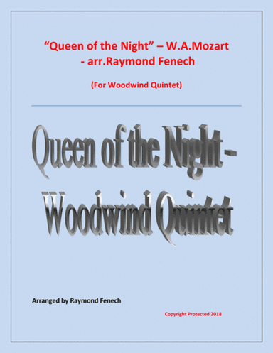 Woodwind Ensemble,Woodwind Quintet Clarinet,Flute,Horn,Oboe - Level 3 - Digital Download SKU: A0.760278 Composed by Wolfgang Amadeus Mozart. Arranged by Raymond Fenech. Classical,Contest,Festival,Instructional,Multicultural,Opera,World. 26 pages. Raymond Fenech #3547275. Published by Raymond Fenech (A0.760278). The Magic Flute (German: Die Zauberflöte), K. 620, is an opera in two acts by Wolfgang Amadeus Mozart to a German libretto by Emanuel Schikaneder. The work is in the form of a Singspiel, a popular form that included both singing and spoken dialogue.[a] The work premiered on 30 September 1791 at Schikaneder's theatre, the Freihaus-Theater auf der Wieden in Vienna, just two months before the composer's premature death. Queen of the Night is a popular aria from The Magic Flute. The Duration is approx. 2.51 minutes and the level is Intermediate. This product was created by a member of ArrangeMe, Hal Leonard’s global self-publishing community of independent composers, arrangers, and songwriters. ArrangeMe allows for the publication of unique arrangements of both popular titles and original compositions from a wide variety of voices and backgrounds. About Digital Downloads Digital Downloads are downloadable sheet music files that can be viewed directly on your computer, tablet or mobile device. Once you download your digital sheet music, you can view and print it at home, school, or anywhere you want to make music, and you don’t have to be connected to the internet. Just purchase, download and play! PLEASE NOTE: Your Digital Download will have a watermark at the bottom of each page that will include your name, purchase date and number of copies purchased. You are only authorized to print the number of copies that you have purchased. You may not digitally distribute or print more copies than purchased for use (i.e., you may not print or digitally distribute individual copies to friends or students).