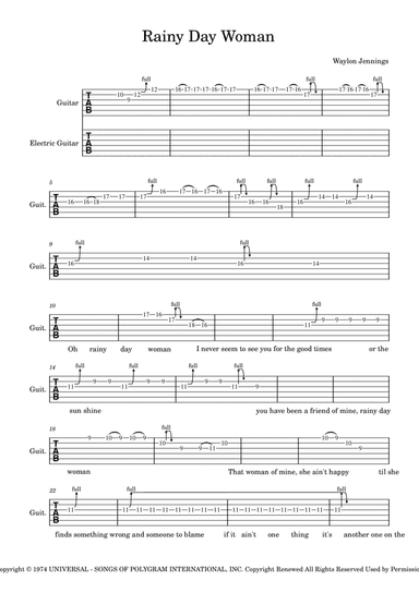 Guitar - Level 3 - Digital Download SKU: A0.951988 By Waylon Jennings. By Waylon Jennings. Arranged by The Smelly Tele. Contemporary. Guitar Tab. 4 pages. The Smelly Tele #6864891. Published by The Smelly Tele (A0.951988). This tablature was written with a b-bender guitar in mind to imitate all the pedal steel licks! If you don't have a b-bender, that's OK! You can still learn Waylon Jenning's Rainy Day Woman, and just bend your b string like you would normally! Plus, this tab includes the pedal steel guitar solo (tabbed out for guitar) and Waylon Jenning's guitar solo! This product was created by a member of ArrangeMe, Hal Leonard’s global self-publishing community of independent composers, arrangers, and songwriters. ArrangeMe allows for the publication of unique arrangements of both popular titles and original compositions from a wide variety of voices and backgrounds. About Digital Downloads Digital Downloads are downloadable sheet music files that can be viewed directly on your computer, tablet or mobile device. Once you download your digital sheet music, you can view and print it at home, school, or anywhere you want to make music, and you don’t have to be connected to the internet. Just purchase, download and play! PLEASE NOTE: Your Digital Download will have a watermark at the bottom of each page that will include your name, purchase date and number of copies purchased. You are only authorized to print the number of copies that you have purchased. You may not digitally distribute or print more copies than purchased for use (i.e., you may not print or digitally distribute individual copies to friends or students).
