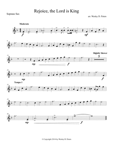 Saxophone Ensemble,Woodwind Ensemble - Level 3 - Digital Download SKU: A0.764088 Composed by John Darwall. Arranged by Wesley D. Peters. Christian,Easter,Sacred,Traditional. 13 pages. Asbury Publishing #4727349. Published by Asbury Publishing (A0.764088). This two-minute arrangement of "Rejoice, the Lord Is King" is appropriate for a Call to Worship, an Offertory, or a Postlude. The arrangement makes use of the hymn tune, DARWALL, which is also used for the hymn "Join All the Glorious Names." A fanfare-like introduction and conclusion bookend this rousing arrangement of a well-loved hymn. The flexible instrumentation is designed to fit many groups.Purchase includes a score and the following parts:Part 1 - Soprano Saxophone (alternate part for Alto Saxophone)Part 2 - 1st Alto SaxophonePart 3 - 2nd Alto SaxophonePart 4 - 1st Tenor Saxophone (alternate part for Alto Saxophone)Part 5 - 2nd Tenor SaxophonePart 6 - Baritone Saxophone (alternate part for Tenor Saxophone). This product was created by a member of ArrangeMe, Hal Leonard's global self-publishing community of independent composers, arrangers, and songwriters. ArrangeMe allows for the publication of unique arrangements of popular titles and original compositions from a variety of voices and backgrounds. The length, difficulty, and retail pricing are determined solely by the discretion of the person who arranged or composed it. About Digital Downloads Digital Downloads are downloadable sheet music files that can be viewed directly on your computer, tablet or mobile device. Once you download your digital sheet music, you can view and print it at home, school, or anywhere you want to make music, and you don’t have to be connected to the internet. Just purchase, download and play! PLEASE NOTE: Your Digital Download will have a watermark at the bottom of each page that will include your name, purchase date and number of copies purchased. You are only authorized to print the number of copies that you have purchased. You may not digitally distribute or print more copies than purchased for use (i.e., you may not print or digitally distribute individual copies to friends or students).