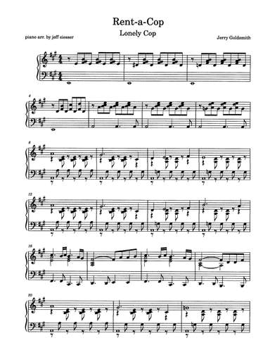 Piano Solo - Level 3 - Digital Download SKU: A0.1113949 By Jerry Goldsmith. By Jerry Goldsmith. Arranged by Jeff Siesser. Film/TV. Score. 2 pages. Mercenary Publications #715848. Published by Mercenary Publications (A0.1113949). This is my piano solo arrangement of Jerry Goldsmith's charming "Lonely Cop" theme from the 1987 film "Rent-A-Cop" starring Burt Reynolds. This product was created by a member of ArrangeMe, Hal Leonard's global self-publishing community of independent composers, arrangers, and songwriters. ArrangeMe allows for the publication of unique arrangements of popular titles and original compositions from a variety of voices and backgrounds. The length, difficulty, and retail pricing are determined solely by the discretion of the person who arranged or composed it. About Digital Downloads Digital Downloads are downloadable sheet music files that can be viewed directly on your computer, tablet or mobile device. Once you download your digital sheet music, you can view and print it at home, school, or anywhere you want to make music, and you don’t have to be connected to the internet. Just purchase, download and play! PLEASE NOTE: Your Digital Download will have a watermark at the bottom of each page that will include your name, purchase date and number of copies purchased. You are only authorized to print the number of copies that you have purchased. You may not digitally distribute or print more copies than purchased for use (i.e., you may not print or digitally distribute individual copies to friends or students).