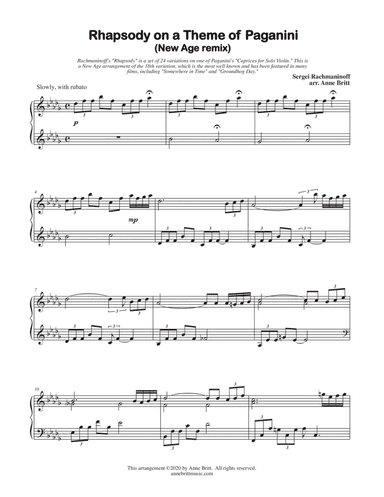 Piano Solo - Level 3 - Digital Download SKU: A0.741242 Composed by Sergei Rachmaninoff. Arranged by Anne Britt. New Age,Romantic Period. Score. 3 pages. Anne Britt #6211215. Published by Anne Britt (A0.741242). Rachmaninoff’s "Rhapsody" is a set of 24 variations on one of Paganini’s Caprices for Solo Violin. This is the 18th variation, which is the most well known of the 24 and has been featured in many films, including "Somewhere in Time" and "Groundhog Day." While Paganini’s theme is in minor, the 18th variation is based on an inversion of the theme and is in a major key. This New Age arrangement keeps the original key of D-flat major – not only does it have a richer sound, but it’s actually an easier key to read the chords with accidentals. 3 pages. Intermediate level.  Included in the "Piano Remixes: Classics Vol. 2" intermediate songbook: https://www.sheetmusicplus.com/title/22083336 Performance time: approximately 2:40.Visit the publisher's website for contact info and some free sheet music downloads: https://annebrittmusic.com/ This product was created by a member of ArrangeMe, Hal Leonard’s global self-publishing community of independent composers, arrangers, and songwriters. ArrangeMe allows for the publication of unique arrangements of both popular titles and original compositions from a wide variety of voices and backgrounds. About Digital Downloads Digital Downloads are downloadable sheet music files that can be viewed directly on your computer, tablet or mobile device. Once you download your digital sheet music, you can view and print it at home, school, or anywhere you want to make music, and you don’t have to be connected to the internet. Just purchase, download and play! PLEASE NOTE: Your Digital Download will have a watermark at the bottom of each page that will include your name, purchase date and number of copies purchased. You are only authorized to print the number of copies that you have purchased. You may not digitally distribute or print more copies than purchased for use (i.e., you may not print or digitally distribute individual copies to friends or students).