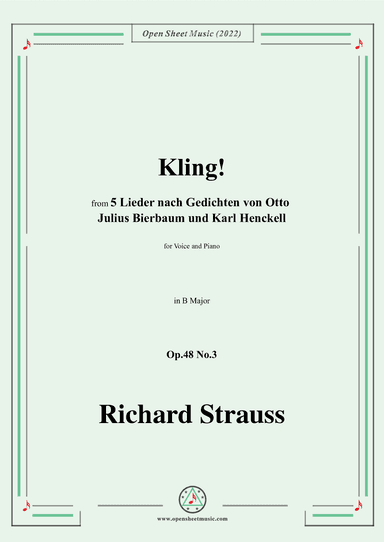 Piano,Vocal,Voice - Level 3 - Digital Download SKU: A0.1216389 Composed by Richard Strauss. Arranged by OSM Press. Classical. Score. 6 pages. Open Cloud #812996. Published by Open Cloud (A0.1216389). This product was created by a member of ArrangeMe, Hal Leonard's global self-publishing community of independent composers, arrangers, and songwriters. ArrangeMe allows for the publication of unique arrangements of popular titles and original compositions from a variety of voices and backgrounds. The length, difficulty, and retail pricing are determined solely by the discretion of the person who arranged or composed it. About Digital Downloads Digital Downloads are downloadable sheet music files that can be viewed directly on your computer, tablet or mobile device. Once you download your digital sheet music, you can view and print it at home, school, or anywhere you want to make music, and you don’t have to be connected to the internet. Just purchase, download and play! PLEASE NOTE: Your Digital Download will have a watermark at the bottom of each page that will include your name, purchase date and number of copies purchased. You are only authorized to print the number of copies that you have purchased. You may not digitally distribute or print more copies than purchased for use (i.e., you may not print or digitally distribute individual copies to friends or students).