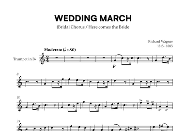 Trumpet Solo - Level 2 - Digital Download SKU: A0.1340295 Composed by Richard Wagner. Arranged by Cadenza Editions. Wedding. Individual part. 1 pages. Cadenza Editions #925968. Published by Cadenza Editions (A0.1340295). This product was created by a member of ArrangeMe, Hal Leonard’s global self-publishing community of independent composers, arrangers, and songwriters. ArrangeMe allows for the publication of unique arrangements of both popular titles and original compositions from a wide variety of voices and backgrounds. About Digital Downloads Digital Downloads are downloadable sheet music files that can be viewed directly on your computer, tablet or mobile device. Once you download your digital sheet music, you can view and print it at home, school, or anywhere you want to make music, and you don’t have to be connected to the internet. Just purchase, download and play! PLEASE NOTE: Your Digital Download will have a watermark at the bottom of each page that will include your name, purchase date and number of copies purchased. You are only authorized to print the number of copies that you have purchased. You may not digitally distribute or print more copies than purchased for use (i.e., you may not print or digitally distribute individual copies to friends or students).
