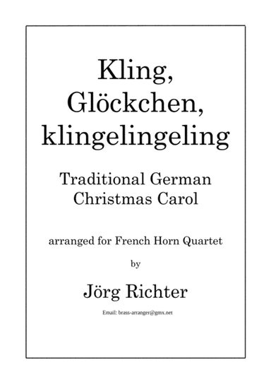 French Horn Quartet Horn - Level 4 - Digital Download SKU: A0.798819 Composed by Traditional. Arranged by Jörg Richter. Christmas,Folk,Traditional. 6 pages. Jörg Richter #5955759. Published by Jörg Richter (A0.798819). The famous traditional German Christmas Carol "Ring, little Bell" (Kling, Glöckchen) in an arrangement for French Horn Quartet. This product was created by a member of ArrangeMe, Hal Leonard's global self-publishing community of independent composers, arrangers, and songwriters. ArrangeMe allows for the publication of unique arrangements of popular titles and original compositions from a variety of voices and backgrounds. The length, difficulty, and retail pricing are determined solely by the discretion of the person who arranged or composed it. About Digital Downloads Digital Downloads are downloadable sheet music files that can be viewed directly on your computer, tablet or mobile device. Once you download your digital sheet music, you can view and print it at home, school, or anywhere you want to make music, and you don’t have to be connected to the internet. Just purchase, download and play! PLEASE NOTE: Your Digital Download will have a watermark at the bottom of each page that will include your name, purchase date and number of copies purchased. You are only authorized to print the number of copies that you have purchased. You may not digitally distribute or print more copies than purchased for use (i.e., you may not print or digitally distribute individual copies to friends or students).