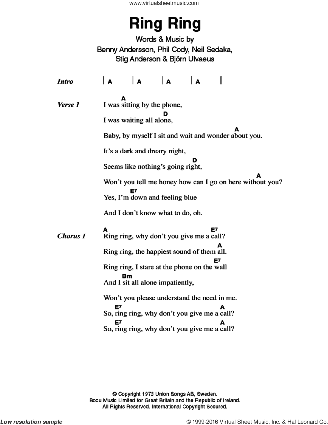 Digital sheet music for guitar (chords)NOTE: guitar chords only, lyrics and melody may be included (please, check the first page above before to buy this item to see what's included)Publisher: Hal LeonardContributors to this music title:Benny Andersson (writer)Bjorn Ulvaeus (writer, writer)Neil Sedaka (writer)Philip Cody (writer)Stig Anderson (writer)This item includes: PDF (digital sheet music to download and print)Instrumentation:guitar (chords)Skill Level:intermediateGenre:popPages:2