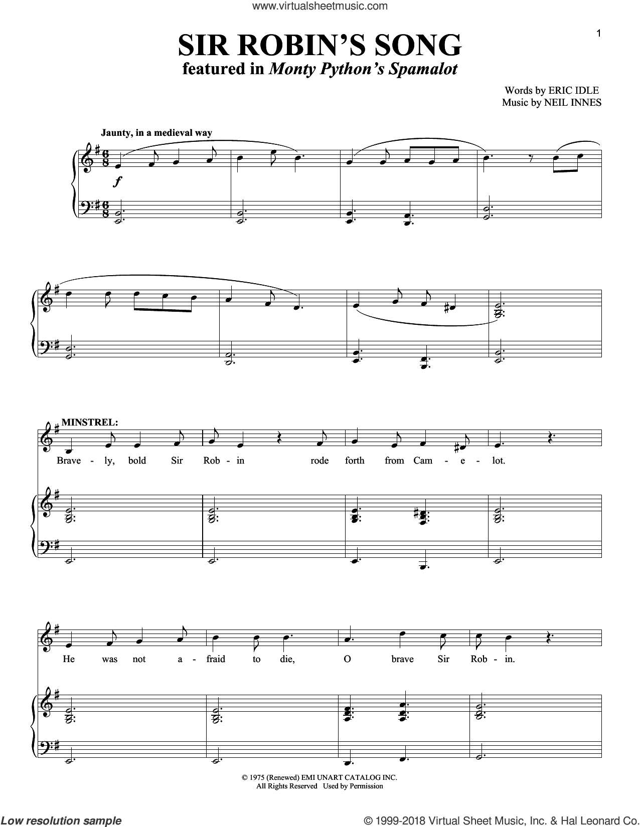 Digital sheet music for voice and pianoNOTE: chords and lyrics included.Publisher: Hal LeonardContributors to this music title:Eric Idle (writer)Neil Innes (writer)This item includes: PDF (digital sheet music to download and print), Interactive Sheet Music (for online playback, transposition and printing). You can transpose this music in any key.Instrumentation:voice and pianoSkill Level:intermediateGenre:film/tv, musical/show, broadway, moviesPages:4