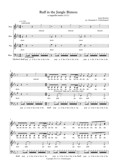 Choral Choir (SATB divisi) - Level 3 - Digital Download SKU: A0.1012494 By The Prodigy. By Liam Paul Paris Howlett. Arranged by Alexandra Louise Uitdenbogerd. A Cappella. Octavo. 3 pages. Alexandra L. Uitdenbogerd #4593599. Published by Alexandra L. Uitdenbogerd (A0.1012494). A cappella "remix" of Ruff in the Jungle Bizness, mostly like the Uplifting Vibes version. Includes simple vocal percussion. The arrangement was a hit at its pub debut, as unsuspecting punters heard a choir do a breakbeat hit with energy and gusto. This product was created by a member of ArrangeMe, Hal Leonard’s global self-publishing community of independent composers, arrangers, and songwriters. ArrangeMe allows for the publication of unique arrangements of both popular titles and original compositions from a wide variety of voices and backgrounds. About Digital Downloads Digital Downloads are downloadable sheet music files that can be viewed directly on your computer, tablet or mobile device. Once you download your digital sheet music, you can view and print it at home, school, or anywhere you want to make music, and you don’t have to be connected to the internet. Just purchase, download and play! PLEASE NOTE: Your Digital Download will have a watermark at the bottom of each page that will include your name, purchase date and number of copies purchased. You are only authorized to print the number of copies that you have purchased. You may not digitally distribute or print more copies than purchased for use (i.e., you may not print or digitally distribute individual copies to friends or students).