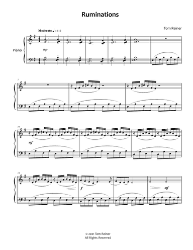Piano Solo - Level 5 - Digital Download SKU: A0.571720 Composed by James Michael Stevens. Arranged by James Michael Stevens. 20th Century,Contemporary,Instructional,Standards,World. Score. 4 pages. James M Stevens Music ASCAP #37975. Published by James M Stevens Music ASCAP (A0.571720). Written on May 31, 2015, "Ruminations" is written in somewhat of a minimalistic framework and is an etude on playing the melody on the top in the R.H. while rocking back and forth with a drone note in the R.H. below. It is a challenging piece to because of the constant hypnotic motion, but pays off with a nice climax in the middle. Would be a nice recital piece for the advanced intermediate to advanced student. James Michael Stevens is a prolific composer residing in Nashville, TN where he serves as the Music Department Chairman of Welch College. This product was created by a member of ArrangeMe, Hal Leonard’s global self-publishing community of independent composers, arrangers, and songwriters. ArrangeMe allows for the publication of unique arrangements of both popular titles and original compositions from a wide variety of voices and backgrounds. About Digital Downloads Digital Downloads are downloadable sheet music files that can be viewed directly on your computer, tablet or mobile device. Once you download your digital sheet music, you can view and print it at home, school, or anywhere you want to make music, and you don’t have to be connected to the internet. Just purchase, download and play! PLEASE NOTE: Your Digital Download will have a watermark at the bottom of each page that will include your name, purchase date and number of copies purchased. You are only authorized to print the number of copies that you have purchased. You may not digitally distribute or print more copies than purchased for use (i.e., you may not print or digitally distribute individual copies to friends or students).