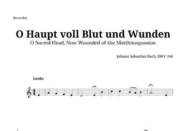 Recorder Solo,Soprano Recorder - Level 1 - Digital Download SKU: A0.1197640 Composed by Johann Sebastian Bach. Arranged by Langanho. Baroque,Christian,Easter,Religious,Sacred. Individual part. 1 pages. Avery Lynn Jordan #796821. Published by Avery Lynn Jordan (A0.1197640). Introducing our newest product, an arrangement for Recorder of Bach's masterpiece "O Haupt voll Blut und Wunden." Adapted from the original choir version, this sheet music features simplified melody and lyrics, making it the perfect tool for music teachers and parents to encourage their children's musical journey. With its clear and easy-to-follow notation, this arrangement is unmatched in the market. Don't miss out on the opportunity to elevate your music experience with our top-of-the-line flute sheet music! This product was created by a member of ArrangeMe, Hal Leonard's global self-publishing community of independent composers, arrangers, and songwriters. ArrangeMe allows for the publication of unique arrangements of popular titles and original compositions from a variety of voices and backgrounds. The length, difficulty, and retail pricing are determined solely by the discretion of the person who arranged or composed it. About Digital Downloads Digital Downloads are downloadable sheet music files that can be viewed directly on your computer, tablet or mobile device. Once you download your digital sheet music, you can view and print it at home, school, or anywhere you want to make music, and you don’t have to be connected to the internet. Just purchase, download and play! PLEASE NOTE: Your Digital Download will have a watermark at the bottom of each page that will include your name, purchase date and number of copies purchased. You are only authorized to print the number of copies that you have purchased. You may not digitally distribute or print more copies than purchased for use (i.e., you may not print or digitally distribute individual copies to friends or students).