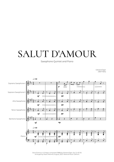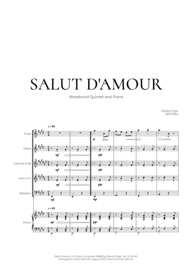 Woodwind Ensemble,Woodwind Quintet Bassoon,Clarinet,Flute,Horn,Oboe - Level 3 - Digital Download SKU: A0.1287815 By Edward Elgar. By Edward Elgar. Arranged by Pedro Merendi. 19th Century,Romantic Period. 18 pages. Pedro Merendi #878896. Published by Pedro Merendi (A0.1287815). Salut D’amour (Woodwind Quintet and Piano) - Edward ElgarThis is a Woodwind Quintet and Piano arrangement of Edward Elgar “Salut D’amour”, Op. 12, IEE 65. Salut D’amour is originally for Violin Solo and Piano Accompaniment.This PDF contains the Full Score and all the Individual Parts!Arrangement and Sheet Music by Pedro Merendi. This product was created by a member of ArrangeMe, Hal Leonard’s global self-publishing community of independent composers, arrangers, and songwriters. ArrangeMe allows for the publication of unique arrangements of both popular titles and original compositions from a wide variety of voices and backgrounds. About Digital Downloads Digital Downloads are downloadable sheet music files that can be viewed directly on your computer, tablet or mobile device. Once you download your digital sheet music, you can view and print it at home, school, or anywhere you want to make music, and you don’t have to be connected to the internet. Just purchase, download and play! PLEASE NOTE: Your Digital Download will have a watermark at the bottom of each page that will include your name, purchase date and number of copies purchased. You are only authorized to print the number of copies that you have purchased. You may not digitally distribute or print more copies than purchased for use (i.e., you may not print or digitally distribute individual copies to friends or students).