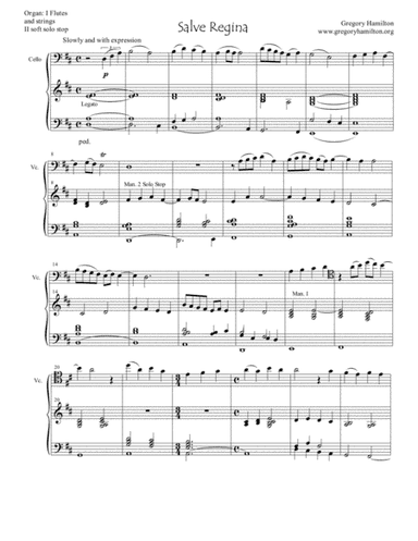 Instrumental Duet Cello,Instrumental Duet,Organ - Digital Download SKU: A0.772046 Composed by Gregory Hamilton. 20th Century,Christian,Sacred,Spiritual. Score and parts. 3 pages. Dr. Gregory Hamilton #4569583. Published by Dr. Gregory Hamilton (A0.772046). Salve Regina for Cello and OrganA piece for Concert or Liturgy, based on the ancient Gregorian Chant.www.gregoryhamilton.orgyoutube channel : ghmus7 This product was created by a member of ArrangeMe, Hal Leonard’s global self-publishing community of independent composers, arrangers, and songwriters. ArrangeMe allows for the publication of unique arrangements of both popular titles and original compositions from a wide variety of voices and backgrounds. About Digital Downloads Digital Downloads are downloadable sheet music files that can be viewed directly on your computer, tablet or mobile device. Once you download your digital sheet music, you can view and print it at home, school, or anywhere you want to make music, and you don’t have to be connected to the internet. Just purchase, download and play! PLEASE NOTE: Your Digital Download will have a watermark at the bottom of each page that will include your name, purchase date and number of copies purchased. You are only authorized to print the number of copies that you have purchased. You may not digitally distribute or print more copies than purchased for use (i.e., you may not print or digitally distribute individual copies to friends or students).