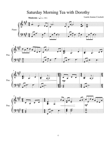 Easy Piano - Level 3 - Digital Download SKU: A0.914270 Composed by Laurie Jeanne Crockett. Concert,Contemporary,Folk,New Age. Score. 3 pages. Laurie Crockett #3905773. Published by Laurie Crockett (A0.914270). "Saturday Morning Tea with Dorothy" is from Laurie Jeanne Crockett's 2nd piano album, "A Simple Life: Contemporary Folk Piano Meditations." "A Simple Life" contains 15 original inspirational, adult contemporary piano tracks to calm the soul and cheer the heart. With a touch of Americana, these pieces will transport you back to a simpler time of porch swings and Sunday suppers. Recorded at Subcat Studios in Syracuse, NY on their Yamaha C7 grand piano, the bass is rich and the treble sings. The sheet music is at the intermediate level which makes this tender, melodic music highly accessible. Laurie Jeanne (ASCAP) is the two time recipient of the Individual Artist Grant, awarded by the Central New York Arts Council, and is a regular contributor to the online music library Pond5. She can also be heard on Spotify where you can check out this album as well as her Christmas CD, "Christmas Past Christmas Present," an arrangement for piano and voice of traditional European carols such as Sans Day Carol and Coventry Carol, including several original Christmas songs. Sheet music is also available for all titles on this album. To learn more about Laurie Jeanne and her music, please visit her website, lauriejeanne.com or her youtube channel, Lauriejeanne Composer. This product was created by a member of ArrangeMe, Hal Leonard's global self-publishing community of independent composers, arrangers, and songwriters. ArrangeMe allows for the publication of unique arrangements of popular titles and original compositions from a variety of voices and backgrounds. The length, difficulty, and retail pricing are determined solely by the discretion of the person who arranged or composed it. About Digital Downloads Digital Downloads are downloadable sheet music files that can be viewed directly on your computer, tablet or mobile device. Once you download your digital sheet music, you can view and print it at home, school, or anywhere you want to make music, and you don’t have to be connected to the internet. Just purchase, download and play! PLEASE NOTE: Your Digital Download will have a watermark at the bottom of each page that will include your name, purchase date and number of copies purchased. You are only authorized to print the number of copies that you have purchased. You may not digitally distribute or print more copies than purchased for use (i.e., you may not print or digitally distribute individual copies to friends or students).