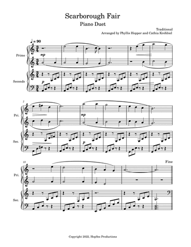 Instrumental Duet Instrumental Duet,Piano - Level 1 - Digital Download SKU: A0.803606 Composed by Traditional. Arranged by Phyllis Hopper and Cathia Krehbiel. Concert,Holiday,Instructional,Love. Score and parts. 4 pages. HopSez Productions #6696591. Published by HopSez Productions (A0.803606). This dorian mode folk song is arranged for an early piano student; the secundo part is designed to be played by a teacher or more advanced student on the same piano. Time: 1:40 This product was created by a member of ArrangeMe, Hal Leonard's global self-publishing community of independent composers, arrangers, and songwriters. ArrangeMe allows for the publication of unique arrangements of popular titles and original compositions from a variety of voices and backgrounds. The length, difficulty, and retail pricing are determined solely by the discretion of the person who arranged or composed it. About Digital Downloads Digital Downloads are downloadable sheet music files that can be viewed directly on your computer, tablet or mobile device. Once you download your digital sheet music, you can view and print it at home, school, or anywhere you want to make music, and you don’t have to be connected to the internet. Just purchase, download and play! PLEASE NOTE: Your Digital Download will have a watermark at the bottom of each page that will include your name, purchase date and number of copies purchased. You are only authorized to print the number of copies that you have purchased. You may not digitally distribute or print more copies than purchased for use (i.e., you may not print or digitally distribute individual copies to friends or students).