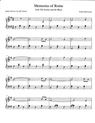 Piano Solo - Level 3 - Digital Download SKU: A0.950017 Composed by Ennio Morricone. Arranged by Jeff Siesser. Contemporary. Score. 3 pages. Mercenary Publications #6197197. Published by Mercenary Publications (A0.950017). This is my piano solo arrangement of Ennio Morricone's nostalgic "Memories of Rome" theme from the 1983 TV Movie "The Scarlet & The Black" starring Gregory Peck and Christopher Plummer. This product was created by a member of ArrangeMe, Hal Leonard’s global self-publishing community of independent composers, arrangers, and songwriters. ArrangeMe allows for the publication of unique arrangements of both popular titles and original compositions from a wide variety of voices and backgrounds. About Digital Downloads Digital Downloads are downloadable sheet music files that can be viewed directly on your computer, tablet or mobile device. Once you download your digital sheet music, you can view and print it at home, school, or anywhere you want to make music, and you don’t have to be connected to the internet. Just purchase, download and play! PLEASE NOTE: Your Digital Download will have a watermark at the bottom of each page that will include your name, purchase date and number of copies purchased. You are only authorized to print the number of copies that you have purchased. You may not digitally distribute or print more copies than purchased for use (i.e., you may not print or digitally distribute individual copies to friends or students).