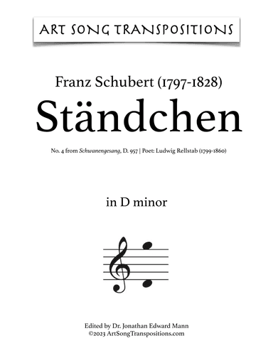 Piano,Vocal,Voice - Digital Download SKU: A0.537481 Composed by Franz Schubert. Arranged by ArtSongTranspositions.com. Romantic Period. Score. 10 pages. AST Publications, LLC #3393915. Published by AST Publications, LLC (A0.537481). ⇨ PAY $0.00 with INSTITUTIONAL MEMBERSHIP✓ 10,000+ art songs and Baroque aria PDFs✓ Transpose sheet music to any key✓ Free for faculty, students, staff, and employees✓ Campus-wide access via IP authentication✓ Off-campus access via EZproxy or SAML This product was created by a member of ArrangeMe, Hal Leonard's global self-publishing community of independent composers, arrangers, and songwriters. ArrangeMe allows for the publication of unique arrangements of popular titles and original compositions from a variety of voices and backgrounds. The length, difficulty, and retail pricing are determined solely by the discretion of the person who arranged or composed it. About Digital Downloads Digital Downloads are downloadable sheet music files that can be viewed directly on your computer, tablet or mobile device. Once you download your digital sheet music, you can view and print it at home, school, or anywhere you want to make music, and you don’t have to be connected to the internet. Just purchase, download and play! PLEASE NOTE: Your Digital Download will have a watermark at the bottom of each page that will include your name, purchase date and number of copies purchased. You are only authorized to print the number of copies that you have purchased. You may not digitally distribute or print more copies than purchased for use (i.e., you may not print or digitally distribute individual copies to friends or students).