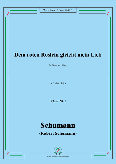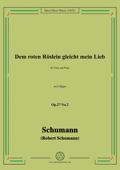 Piano,Vocal,Voice - Level 3 - Digital Download SKU: A0.675239 Composed by Robert Schumann. Arranged by Open Cloud. Classical,Romantic Period. Score. 4 pages. Open Cloud #6616643. Published by Open Cloud (A0.675239). This product is a digital sheet music in PDF format. The music was composed by Schumann (Robert Schumann), 1810-1856,for Voice and Piano, published by More Sheet Music Press. This product was created by a member of ArrangeMe, Hal Leonard's global self-publishing community of independent composers, arrangers, and songwriters. ArrangeMe allows for the publication of unique arrangements of popular titles and original compositions from a variety of voices and backgrounds. The length, difficulty, and retail pricing are determined solely by the discretion of the person who arranged or composed it. About Digital Downloads Digital Downloads are downloadable sheet music files that can be viewed directly on your computer, tablet or mobile device. Once you download your digital sheet music, you can view and print it at home, school, or anywhere you want to make music, and you don’t have to be connected to the internet. Just purchase, download and play! PLEASE NOTE: Your Digital Download will have a watermark at the bottom of each page that will include your name, purchase date and number of copies purchased. You are only authorized to print the number of copies that you have purchased. You may not digitally distribute or print more copies than purchased for use (i.e., you may not print or digitally distribute individual copies to friends or students).