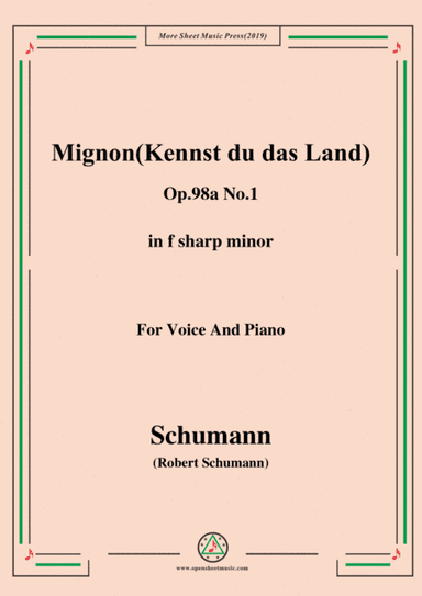 Piano,Vocal,Voice - Level 3 - Digital Download SKU: A0.658750 Composed by Robert Schumann. Arranged by MPS. Romantic Period. Score. 9 pages. Classic Piano sheetz #6292747. Published by Classic Piano sheetz (A0.658750). Schumann-Mignon(Kennst du das Land),Op.98a No.1 in f♯ minor . This product was created by a member of ArrangeMe, Hal Leonard's global self-publishing community of independent composers, arrangers, and songwriters. ArrangeMe allows for the publication of unique arrangements of popular titles and original compositions from a variety of voices and backgrounds. The length, difficulty, and retail pricing are determined solely by the discretion of the person who arranged or composed it. About Digital Downloads Digital Downloads are downloadable sheet music files that can be viewed directly on your computer, tablet or mobile device. Once you download your digital sheet music, you can view and print it at home, school, or anywhere you want to make music, and you don’t have to be connected to the internet. Just purchase, download and play! PLEASE NOTE: Your Digital Download will have a watermark at the bottom of each page that will include your name, purchase date and number of copies purchased. You are only authorized to print the number of copies that you have purchased. You may not digitally distribute or print more copies than purchased for use (i.e., you may not print or digitally distribute individual copies to friends or students).