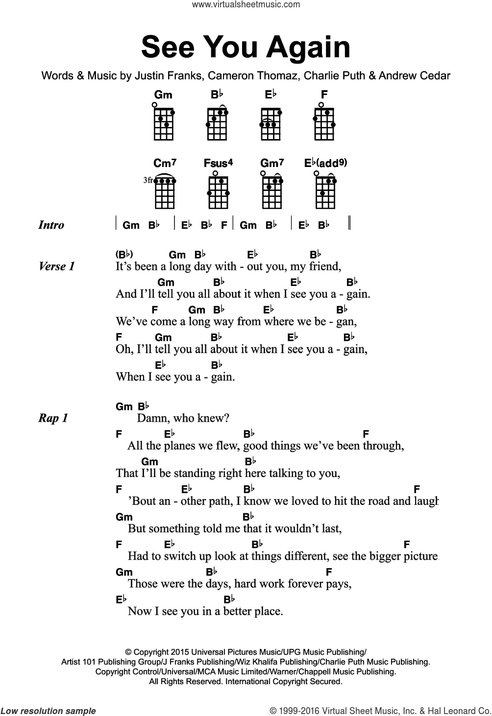 Digital sheet music for ukulele (chords)NOTE: ukulele chords and lyrics may be included (please, check the first page above before to buy this item to see what's included)Publisher: Hal LeonardContributors to this music title:Andrew Cedar (writer)Cameron Thomaz (writer)Charlie Puth (writer)Justin Franks (writer)This item includes: PDF (digital sheet music to download and print)Instrumentation:ukulele (chords)Skill Level:intermediateGenre:hip-hop, popPages:3