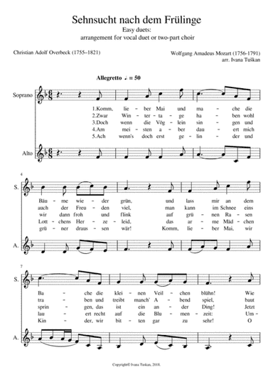 Choral Choir (SA) - Level 1 - Digital Download SKU: A0.793813 Composed by Wolfgang Amadeus Mozart. Arranged by Ivana Tuškan. A Cappella,Classical,Instructional,Standards. Octavo. 2 pages. Ivana Tuskan #3602065. Published by Ivana Tuskan (A0.793813). Arrangement of Mozart's song (originally written for solo voice and piano). It can be sang as a duet or two part choir a cappella. Key: F major This product was created by a member of ArrangeMe, Hal Leonard’s global self-publishing community of independent composers, arrangers, and songwriters. ArrangeMe allows for the publication of unique arrangements of both popular titles and original compositions from a wide variety of voices and backgrounds. About Digital Downloads Digital Downloads are downloadable sheet music files that can be viewed directly on your computer, tablet or mobile device. Once you download your digital sheet music, you can view and print it at home, school, or anywhere you want to make music, and you don’t have to be connected to the internet. Just purchase, download and play! PLEASE NOTE: Your Digital Download will have a watermark at the bottom of each page that will include your name, purchase date and number of copies purchased. You are only authorized to print the number of copies that you have purchased. You may not digitally distribute or print more copies than purchased for use (i.e., you may not print or digitally distribute individual copies to friends or students).
