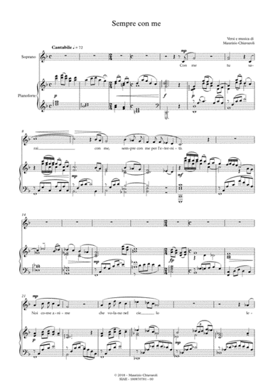 High Voice,Vocal Solo - Level 3 - Digital Download SKU: A0.790408 Composed by Maurizio Chiavaroli. Contemporary,Standards,World. 2 pages. Maurizio Chiavaroli #3626835. Published by Maurizio Chiavaroli (A0.790408). Composizione originale per pianoforte e sopranoOriginal composition for piano and soprano voice. This product was created by a member of ArrangeMe, Hal Leonard’s global self-publishing community of independent composers, arrangers, and songwriters. ArrangeMe allows for the publication of unique arrangements of both popular titles and original compositions from a wide variety of voices and backgrounds. About Digital Downloads Digital Downloads are downloadable sheet music files that can be viewed directly on your computer, tablet or mobile device. Once you download your digital sheet music, you can view and print it at home, school, or anywhere you want to make music, and you don’t have to be connected to the internet. Just purchase, download and play! PLEASE NOTE: Your Digital Download will have a watermark at the bottom of each page that will include your name, purchase date and number of copies purchased. You are only authorized to print the number of copies that you have purchased. You may not digitally distribute or print more copies than purchased for use (i.e., you may not print or digitally distribute individual copies to friends or students).