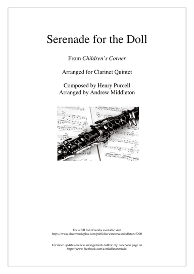 Woodwind Ensemble,Woodwind Quintet Clarinet - Level 3 - Digital Download SKU: A0.805356 Composed by Claude Debussy. Arranged by Andrew Middleton. 20th Century,Children,Classical. 22 pages. Andrew Middleton #412393. Published by Andrew Middleton (A0.805356). From Debussy's Children's Corner, Serenade of the Doll, arranged for Clarinet Quintet. This graceful piece is triple time is based around a pentatonic scale that describes a porcelain doll. This piece is ideal for the intermediate ensemble. For more updates on new arrangements follow my Facebook page on https://www.facebook.com/a.middletonmusic/ Or subscribe to my Youtube page at https://www.youtube.com/channel/UCClIYqddA2wMpdaxSq3BKEw?view_as=subscriber. This product was created by a member of ArrangeMe, Hal Leonard’s global self-publishing community of independent composers, arrangers, and songwriters. ArrangeMe allows for the publication of unique arrangements of both popular titles and original compositions from a wide variety of voices and backgrounds. About Digital Downloads Digital Downloads are downloadable sheet music files that can be viewed directly on your computer, tablet or mobile device. Once you download your digital sheet music, you can view and print it at home, school, or anywhere you want to make music, and you don’t have to be connected to the internet. Just purchase, download and play! PLEASE NOTE: Your Digital Download will have a watermark at the bottom of each page that will include your name, purchase date and number of copies purchased. You are only authorized to print the number of copies that you have purchased. You may not digitally distribute or print more copies than purchased for use (i.e., you may not print or digitally distribute individual copies to friends or students).