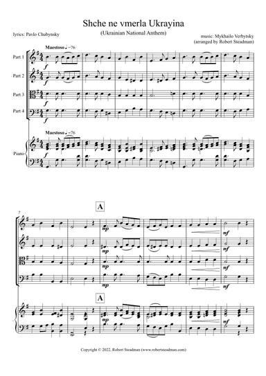 Alto Flute,B-Flat Trumpet,B-Flat Tuba,B-Flat trombone,Baritone Horn TC/Euphonium,Bassoon,Cello,Double Bass,E-Flat Clarinet,Glockenspiel,Horn in E-Flat,Oboe,Recorder,Viola - Level 3 - Digital Download SKU: A0.1095621 Composed by Mykhailo Verbytsky. Arranged by Robert Steadman. Chamber,Classical,Folk,Multicultural,Patriotic,World. 21 pages. Robert Steadman #699607. Published by Robert Steadman (A0.1095621). Robert Steadman's arrangement of the Ukrainian National Anthem for flexible 4-part ensemble - score and parts included. This product was created by a member of ArrangeMe, Hal Leonard’s global self-publishing community of independent composers, arrangers, and songwriters. ArrangeMe allows for the publication of unique arrangements of both popular titles and original compositions from a wide variety of voices and backgrounds. About Digital Downloads Digital Downloads are downloadable sheet music files that can be viewed directly on your computer, tablet or mobile device. Once you download your digital sheet music, you can view and print it at home, school, or anywhere you want to make music, and you don’t have to be connected to the internet. Just purchase, download and play! PLEASE NOTE: Your Digital Download will have a watermark at the bottom of each page that will include your name, purchase date and number of copies purchased. You are only authorized to print the number of copies that you have purchased. You may not digitally distribute or print more copies than purchased for use (i.e., you may not print or digitally distribute individual copies to friends or students).