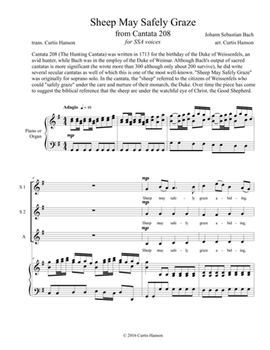 Choral Choir (SSA) - Level 2 - Digital Download SKU: A0.719676 Composed by Johann Sebastian Bach. Arranged by Curtis Hanson. Baroque,Sacred. Octavo. 7 pages. Curtis Hanson #2072419. Published by Curtis Hanson (A0.719676). This beloved soprano aria from Cantata 208 is here set for SSA voices with piano or organ accompaniment. A digital keyboard on a harpsichord setting would also work well. Although generally interpreted today as a sacred text, an explanation of the secular origin of the cantata is printed. Translation is by the arranger. This is a wonderful piece for choirs of nearly any skill level. This product was created by a member of ArrangeMe, Hal Leonard's global self-publishing community of independent composers, arrangers, and songwriters. ArrangeMe allows for the publication of unique arrangements of popular titles and original compositions from a variety of voices and backgrounds. The length, difficulty, and retail pricing are determined solely by the discretion of the person who arranged or composed it. About Digital Downloads Digital Downloads are downloadable sheet music files that can be viewed directly on your computer, tablet or mobile device. Once you download your digital sheet music, you can view and print it at home, school, or anywhere you want to make music, and you don’t have to be connected to the internet. Just purchase, download and play! PLEASE NOTE: Your Digital Download will have a watermark at the bottom of each page that will include your name, purchase date and number of copies purchased. You are only authorized to print the number of copies that you have purchased. You may not digitally distribute or print more copies than purchased for use (i.e., you may not print or digitally distribute individual copies to friends or students).