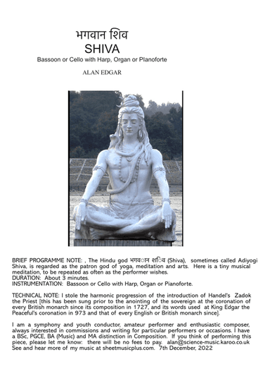 Instrumental Duet Bassoon,Harp,Instrumental Duet - Level 1 - Digital Download SKU: A0.1147922 Composed by Alan Edgar. Classical. Score and parts. 2 pages. Alan Edgar Ted Moon #748121. Published by Alan Edgar Ted Moon (A0.1147922). The Hindu god Shiva, sometimes called Adiyogi Shiva, is regarded as the patron god of yoga, meditation and arts. Here is a tiny musical meditation, to be repeated as often as the performer wishes. DURATION: About 3 minutes. This product was created by a member of ArrangeMe, Hal Leonard's global self-publishing community of independent composers, arrangers, and songwriters. ArrangeMe allows for the publication of unique arrangements of popular titles and original compositions from a variety of voices and backgrounds. The length, difficulty, and retail pricing are determined solely by the discretion of the person who arranged or composed it. About Digital Downloads Digital Downloads are downloadable sheet music files that can be viewed directly on your computer, tablet or mobile device. Once you download your digital sheet music, you can view and print it at home, school, or anywhere you want to make music, and you don’t have to be connected to the internet. Just purchase, download and play! PLEASE NOTE: Your Digital Download will have a watermark at the bottom of each page that will include your name, purchase date and number of copies purchased. You are only authorized to print the number of copies that you have purchased. You may not digitally distribute or print more copies than purchased for use (i.e., you may not print or digitally distribute individual copies to friends or students).