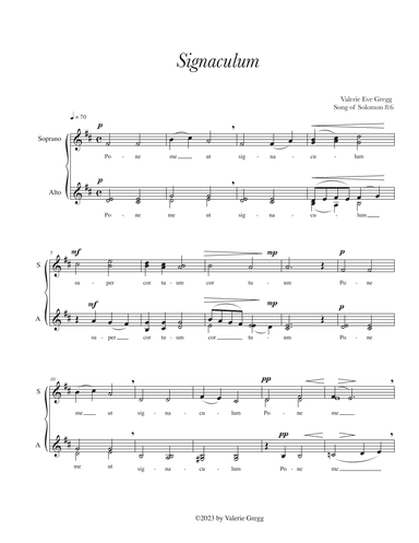 Choral Choir,Choral (SSAA) - Level 3 - Digital Download SKU: A0.1350727 By Valerie Gregg. By Valerie Gregg. 21st Century,A Cappella,Chamber,Religious,Wedding. 5 pages. Valerie Eve Gregg #935546. Published by Valerie Eve Gregg (A0.1350727). This is an original composition written by Valerie Gregg. The lyrics are taken from Song of Solomon 8:6-7. This is written for SA choir. This choral piece is dedicated to the loved ones that have already passed. Though their bodies are no longer present, their love will forever be present, for love is stronger then death. This product was created by a member of ArrangeMe, Hal Leonard’s global self-publishing community of independent composers, arrangers, and songwriters. ArrangeMe allows for the publication of unique arrangements of both popular titles and original compositions from a wide variety of voices and backgrounds. About Digital Downloads Digital Downloads are downloadable sheet music files that can be viewed directly on your computer, tablet or mobile device. Once you download your digital sheet music, you can view and print it at home, school, or anywhere you want to make music, and you don’t have to be connected to the internet. Just purchase, download and play! PLEASE NOTE: Your Digital Download will have a watermark at the bottom of each page that will include your name, purchase date and number of copies purchased. You are only authorized to print the number of copies that you have purchased. You may not digitally distribute or print more copies than purchased for use (i.e., you may not print or digitally distribute individual copies to friends or students).