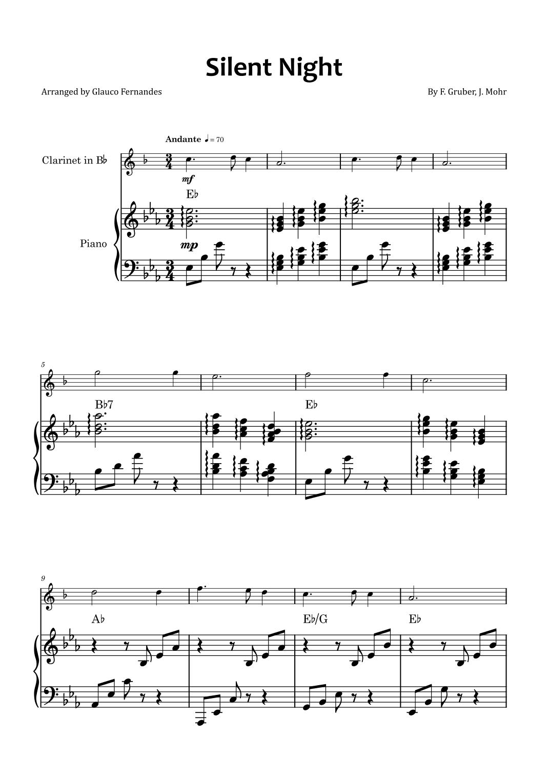 Silent Night - Clarinet and piano with chord symbols (arr. Glauco Fernandes)