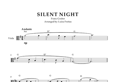 Viola Solo - Level 1 - Digital Download SKU: A0.1126673 By Franz Xaver Gruber. By Franz Xaver Gruber. Arranged by Luíza Freitas. Christian,Christmas,Holiday,Religious,Traditional. Individual part. 1 pages. Luíza Freitas #727319. Published by Luíza Freitas (A0.1126673). Silent Night for easy viola solo sheet music. Perfect arrangement for students of this beautiful Christmas Song. This product was created by a member of ArrangeMe, Hal Leonard’s global self-publishing community of independent composers, arrangers, and songwriters. ArrangeMe allows for the publication of unique arrangements of both popular titles and original compositions from a wide variety of voices and backgrounds. About Digital Downloads Digital Downloads are downloadable sheet music files that can be viewed directly on your computer, tablet or mobile device. Once you download your digital sheet music, you can view and print it at home, school, or anywhere you want to make music, and you don’t have to be connected to the internet. Just purchase, download and play! PLEASE NOTE: Your Digital Download will have a watermark at the bottom of each page that will include your name, purchase date and number of copies purchased. You are only authorized to print the number of copies that you have purchased. You may not digitally distribute or print more copies than purchased for use (i.e., you may not print or digitally distribute individual copies to friends or students).