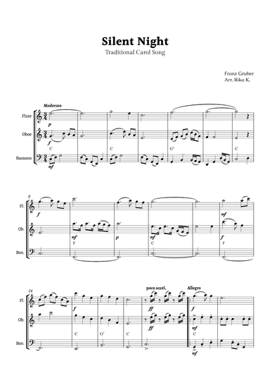 Woodwind Ensemble,Woodwind Trio Flute - Level 1 - Digital Download SKU: A0.709254 Composed by Franz Xaver Gruber. Arranged by Paulo Galvao Filho. Christmas. 6 pages. Paulo Galvao Filho #6371879. Published by Paulo Galvao Filho (A0.709254). This product was created by a member of ArrangeMe, Hal Leonard’s global self-publishing community of independent composers, arrangers, and songwriters. ArrangeMe allows for the publication of unique arrangements of both popular titles and original compositions from a wide variety of voices and backgrounds. About Digital Downloads Digital Downloads are downloadable sheet music files that can be viewed directly on your computer, tablet or mobile device. Once you download your digital sheet music, you can view and print it at home, school, or anywhere you want to make music, and you don’t have to be connected to the internet. Just purchase, download and play! PLEASE NOTE: Your Digital Download will have a watermark at the bottom of each page that will include your name, purchase date and number of copies purchased. You are only authorized to print the number of copies that you have purchased. You may not digitally distribute or print more copies than purchased for use (i.e., you may not print or digitally distribute individual copies to friends or students).