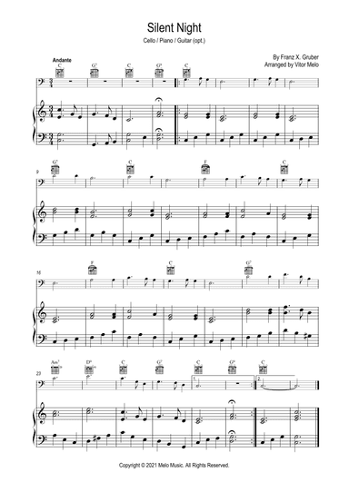 Cello,Piano - Digital Download SKU: A0.496130 Composed by Franz X. Gruber. Arranged by Vitor Melo. Christmas,Holiday,Romantic Period,Sacred,Traditional. Score and part. 2 pages. Published by Melo Music (A0.496130). Composed in 1818 by Franz X. Gruber, Silent Night is one of the most traditional Christmas carols. Arranged for violoncello, with piano and/or guitar accompaniment. Arrangement by Vitor Melo. Key: C major. This product was created by a member of ArrangeMe, Hal Leonard's global self-publishing community of independent composers, arrangers, and songwriters. ArrangeMe allows for the publication of unique arrangements of popular titles and original compositions from a variety of voices and backgrounds. The length, difficulty, and retail pricing are determined solely by the discretion of the person who arranged or composed it. About Digital Downloads Digital Downloads are downloadable sheet music files that can be viewed directly on your computer, tablet or mobile device. Once you download your digital sheet music, you can view and print it at home, school, or anywhere you want to make music, and you don’t have to be connected to the internet. Just purchase, download and play! PLEASE NOTE: Your Digital Download will have a watermark at the bottom of each page that will include your name, purchase date and number of copies purchased. You are only authorized to print the number of copies that you have purchased. You may not digitally distribute or print more copies than purchased for use (i.e., you may not print or digitally distribute individual copies to friends or students).