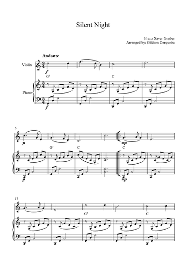 Piano,Violin - Level 2 - Digital Download SKU: A0.1346709 Composed by Franz Xaver Gruber. Arranged by Glauco Fernandes. Chamber,Christmas,Holiday,Traditional. 3 pages. Glauco Fernandes #931488. Published by Glauco Fernandes (A0.1346709). Discover the magic of Christmas through the enchanting intermediate arrangement of the classic "Silent Night." This meticulously crafted sheet music allows instrumentalists to explore the timeless beauty of this melody, enhancing their musical skills in an engaging manner.Ideal for intermediate-level musicians, this sheet music offers a unique interpretation of "Silent Night," capturing the emotional essence of the Christmas carol. Whether you are a teacher looking to inspire your students or a student eager for a rewarding musical challenge, this sheet music provides an enriching and melodic experience.By acquiring this sheet music, you not only add a classic piece to your repertoire but also connect with the Christmas musical tradition in a special way. Immerse yourself in the serenity of this timeless composition and elevate your musical practice during the festive season.Feel the magic of "Silent Night" come to life through the notes of this intermediate arrangement.If you wish to explore more high-quality sheet music, consider searching for Glauco Fernandes in the website's search bar.For inquiries, contact Glauco Fernandes at [email protected] Glauco Fernandes's collection to enhance your musical journey even further. Get your sheet music today and dive into the enchanting atmosphere that only Christmas music can provide. This product was created by a member of ArrangeMe, Hal Leonard’s global self-publishing community of independent composers, arrangers, and songwriters. ArrangeMe allows for the publication of unique arrangements of both popular titles and original compositions from a wide variety of voices and backgrounds. About Digital Downloads Digital Downloads are downloadable sheet music files that can be viewed directly on your computer, tablet or mobile device. Once you download your digital sheet music, you can view and print it at home, school, or anywhere you want to make music, and you don’t have to be connected to the internet. Just purchase, download and play! PLEASE NOTE: Your Digital Download will have a watermark at the bottom of each page that will include your name, purchase date and number of copies purchased. You are only authorized to print the number of copies that you have purchased. You may not digitally distribute or print more copies than purchased for use (i.e., you may not print or digitally distribute individual copies to friends or students).