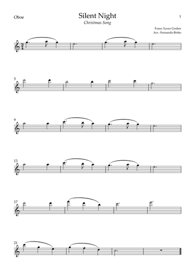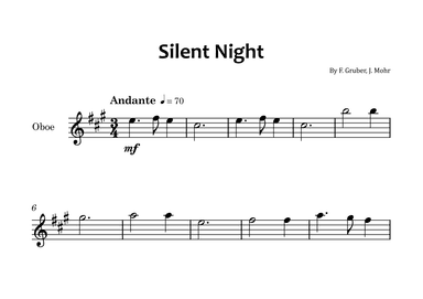 Oboe,Piano - Level 3 - Digital Download SKU: A0.786732 Composed by Joseph Mohr, Franz Gruber. Arranged by Beka Wilson. Christian,Christmas,Sacred. Score and part. 4 pages. Beka Wilson #6414875. Published by Beka Wilson (A0.786732). A gorgeous, thoughtful rendition of an old Christmas classic. "Silent Night" is said to have been composed by a priest and an organist in Austria on a Christmas Eve, making this a perfect piece to play at a party, recital, or a church service surrounding the holidays.Length: around 2.5 minutesLevel: intermediate for most instruments4 pages (includes score and separate solo part)This arrangement is available as a solo for flute, oboe, clarinet, bassoon, alto sax, tenor sax, F horn, trumpet, trombone, violin, viola, and cello. Want this arrangement in a different key or for a different set of instruments? Shoot me an email at [email protected] for a custom version of this arrangement that I can post on Sheet Music Plus for you. This product was created by a member of ArrangeMe, Hal Leonard’s global self-publishing community of independent composers, arrangers, and songwriters. ArrangeMe allows for the publication of unique arrangements of both popular titles and original compositions from a wide variety of voices and backgrounds. About Digital Downloads Digital Downloads are downloadable sheet music files that can be viewed directly on your computer, tablet or mobile device. Once you download your digital sheet music, you can view and print it at home, school, or anywhere you want to make music, and you don’t have to be connected to the internet. Just purchase, download and play! PLEASE NOTE: Your Digital Download will have a watermark at the bottom of each page that will include your name, purchase date and number of copies purchased. You are only authorized to print the number of copies that you have purchased. You may not digitally distribute or print more copies than purchased for use (i.e., you may not print or digitally distribute individual copies to friends or students).