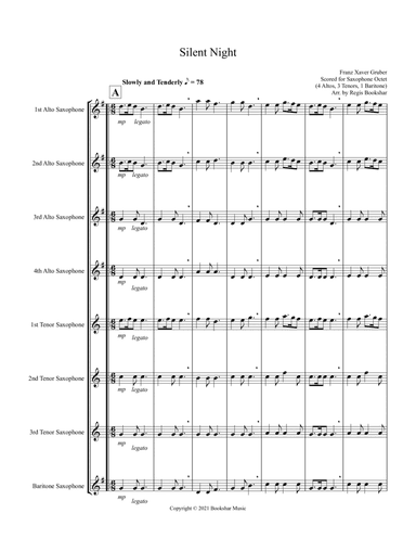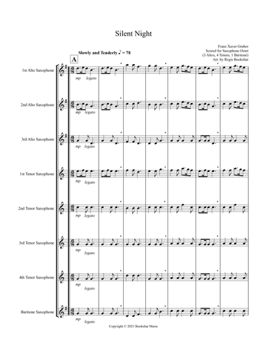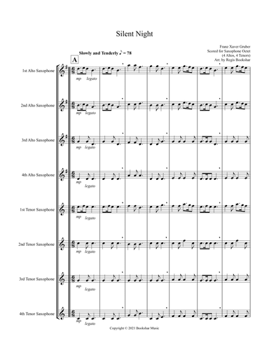 Saxophone Ensemble,Woodwind Ensemble Alto Saxophone,Tenor Saxophone - Level 3 - Digital Download SKU: A0.813993 Composed by Franz Xaver Gruber. Arranged by Regis Bookshar. Christmas,Instructional,Multicultural,World. 11 pages. Regis Bookshar #6636643. Published by Regis Bookshar (A0.813993). Saxophone Octet - Intermediate - Digital Download. This arrangement of "Silent Night", or in German, "Stille Nacht", would be a wonderful addition to any music library and could be performed for Christmas concerts, recitals, and, especially, church services. It is equally suitable for junior and senior high school students and even older musicians. Depending on their ability, younger musicians would also enjoy playing this selection. Included are a score and a complete set of parts (11 pages). This selection is one of the many arrangements from The Regis Bookshar Trumpet Ensemble's extensive music library which are being made available for the first time."Silent Night" is probably the most popular Christmas carol ever written. It was composed in 1818 by Franz Xaver Gruber to lyrics by Joseph Mohr and was first performed on Christmas Eve at St. Nicholas parish church in Oberndorf, a small village in present-day Austria. A young Catholic priest, Father Joseph Mohr, had written the poem, "Stille Nacht", in 1816 and had gone to Oberndorf in 1817. The melody was composed by Franz Xaver Gruber, schoolmaster and organist in the nearby village of Arnsdorf. On Christmas Eve, 1818, Mohr brought the words to Gruber and asked him to compose a melody and guitar accompaniment for that night's mass, after river flooding had possibly damaged the church organ. The church was eventually destroyed by repeated flooding and has since been replaced with the Silent-Night-Chapel.According to Gruber, Karl Mauracher, an organ builder who serviced the instrument at the Oberndorf church, was enamored with the song, and took the composition home with him to the Ziller Valley in Tyrol, Austria. From there, two traveling families of folk singers, the Strassers and the Rainers, included the tune in their shows. The Rainers were already singing it around Christmas, 1819, and once performed it for an audience that included Franz I of Austria and Alexander I of Russia. They also gave the first performance of the song in the United States in New York City in 1839. By the 1840's, the song was well known and was reported to be a favorite of Frederick William IV of Prussia. During this period, the melody changed slightly to become the version that is commonly heard today. The version of the melody that is generally used today is a slow, meditative lullaby, or pastoral, differing slightly from Gruber's original which has a "moderate" tempo. The song has been translated into about 140 languages and has been recorded by many singers across many music genres. The version sung by Bing Crosby in 1935, has sold over 10 million copies as a single.In this arrangement of "Silent Night", Regis Bookshar has kept the basic form of this familiar Christmas carol, but has also included a descant during the third verse. Also, in addition to this version for a Saxophone Octet, consisting of 4 Alto Saxophones and 4 Tenor Saxophones, there are other arrangements of "Silent Night" available for a variety of instrumental ensembles. There are Quintets and Octets readily available for purchase. Please take the time to look for other versions of this composition. You may find something else that might also suit your needs.I would also encourage you to search for other arrangements by Regis Bookshar, as well, as there are numerous arrangements in a wide variety of styles, also available for purchase. You may find something else which might interest you. Please continue to check periodically because new arrangements are being added as often as possible. I'm certain that this wonderful arrangement of "Silent Night" will continue to entertain both performers and audiences alike for years to come. This product was created by a member of ArrangeMe, Hal Leonard’s global self-publishing community of independent composers, arrangers, and songwriters. ArrangeMe allows for the publication of unique arrangements of both popular titles and original compositions from a wide variety of voices and backgrounds. About Digital Downloads Digital Downloads are downloadable sheet music files that can be viewed directly on your computer, tablet or mobile device. Once you download your digital sheet music, you can view and print it at home, school, or anywhere you want to make music, and you don’t have to be connected to the internet. Just purchase, download and play! PLEASE NOTE: Your Digital Download will have a watermark at the bottom of each page that will include your name, purchase date and number of copies purchased. You are only authorized to print the number of copies that you have purchased. You may not digitally distribute or print more copies than purchased for use (i.e., you may not print or digitally distribute individual copies to friends or students).