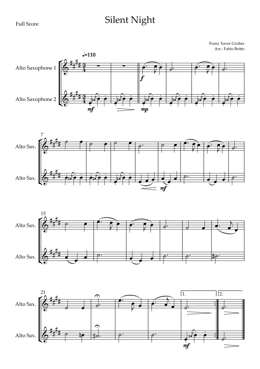 Silent Night (Christmas Song) for Alto Saxophone Duo (arr. Fabio Britto)