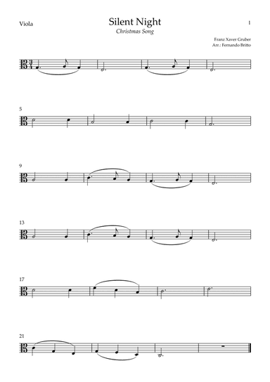 Viola Solo - Level 3 - Digital Download SKU: A0.688408 Composed by Franz Xaver Gruber. Arranged by Fernando Britto. Children,Christmas,Holiday,Traditional. Individual part. 1 pages. Minhas Partituras #6607191. Published by Minhas Partituras (A0.688408). Arrangement of the song Silent Night (Christmas Song) for Viola Solo (In C Major). This product was created by a member of ArrangeMe, Hal Leonard's global self-publishing community of independent composers, arrangers, and songwriters. ArrangeMe allows for the publication of unique arrangements of popular titles and original compositions from a variety of voices and backgrounds. The length, difficulty, and retail pricing are determined solely by the discretion of the person who arranged or composed it. About Digital Downloads Digital Downloads are downloadable sheet music files that can be viewed directly on your computer, tablet or mobile device. Once you download your digital sheet music, you can view and print it at home, school, or anywhere you want to make music, and you don’t have to be connected to the internet. Just purchase, download and play! PLEASE NOTE: Your Digital Download will have a watermark at the bottom of each page that will include your name, purchase date and number of copies purchased. You are only authorized to print the number of copies that you have purchased. You may not digitally distribute or print more copies than purchased for use (i.e., you may not print or digitally distribute individual copies to friends or students).
