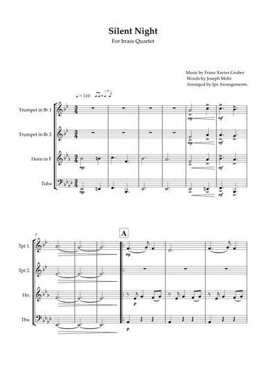Brass Quartet Horn,Trumpet,Tuba - Level 2 - Digital Download SKU: A0.1340562 Composed by Franz Xaver Gruber. Arranged by Jps Arrangements. Christmas,Classical,Instructional,Multicultural,Traditional,World. 7 pages. Jps Arrangements #926149. Published by Jps Arrangements (A0.1340562). Merry Christmas!This is a beautiful brass quartet arrangement, very easy to play from "Silent Night", one of the most popular Christmas songs.Silent Night sheet music for brass quartet, the music is in Ab major. The score does nothas the numbers.The piece is ready for you to play in year-end recitals and performances. This product was created by a member of ArrangeMe, Hal Leonard’s global self-publishing community of independent composers, arrangers, and songwriters. ArrangeMe allows for the publication of unique arrangements of both popular titles and original compositions from a wide variety of voices and backgrounds. About Digital Downloads Digital Downloads are downloadable sheet music files that can be viewed directly on your computer, tablet or mobile device. Once you download your digital sheet music, you can view and print it at home, school, or anywhere you want to make music, and you don’t have to be connected to the internet. Just purchase, download and play! PLEASE NOTE: Your Digital Download will have a watermark at the bottom of each page that will include your name, purchase date and number of copies purchased. You are only authorized to print the number of copies that you have purchased. You may not digitally distribute or print more copies than purchased for use (i.e., you may not print or digitally distribute individual copies to friends or students).