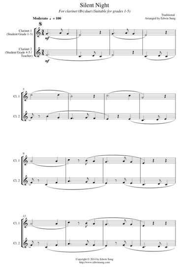 Clarinet Solo - Level 1 - Digital Download SKU: A0.730973 Composed by Traditional. Arranged by Edwin Sung. Children,Christmas,Classical,Instructional. Individual part. 3 pages. Edwin Sung #3273. Published by Edwin Sung (A0.730973). This duet piece emphasises on teamwork / co-operation, while not setting the bar too high for the players - music appreciation / enjoyment is what all musicians like! Melodies and harmonies do cross over occasionally to gain a balance of roles between the players. That's why this piece is recommended to everyone, ranging from beginners to advanced, to perform professionally or leisurely during Christmas ideally! This product was created by a member of ArrangeMe, Hal Leonard’s global self-publishing community of independent composers, arrangers, and songwriters. ArrangeMe allows for the publication of unique arrangements of both popular titles and original compositions from a wide variety of voices and backgrounds. About Digital Downloads Digital Downloads are downloadable sheet music files that can be viewed directly on your computer, tablet or mobile device. Once you download your digital sheet music, you can view and print it at home, school, or anywhere you want to make music, and you don’t have to be connected to the internet. Just purchase, download and play! PLEASE NOTE: Your Digital Download will have a watermark at the bottom of each page that will include your name, purchase date and number of copies purchased. You are only authorized to print the number of copies that you have purchased. You may not digitally distribute or print more copies than purchased for use (i.e., you may not print or digitally distribute individual copies to friends or students).