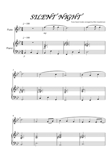 Flute Solo - Level 2 - Digital Download SKU: A0.740988 Composed by Franz Xaver Gruber. Arranged by Ellen Macpherson. Christmas. Individual part. 10 pages. Ellen Macpherson #6549889. Published by Ellen Macpherson (A0.740988). Silent Night for Flute and Piano. This product was created by a member of ArrangeMe, Hal Leonard’s global self-publishing community of independent composers, arrangers, and songwriters. ArrangeMe allows for the publication of unique arrangements of both popular titles and original compositions from a wide variety of voices and backgrounds. About Digital Downloads Digital Downloads are downloadable sheet music files that can be viewed directly on your computer, tablet or mobile device. Once you download your digital sheet music, you can view and print it at home, school, or anywhere you want to make music, and you don’t have to be connected to the internet. Just purchase, download and play! PLEASE NOTE: Your Digital Download will have a watermark at the bottom of each page that will include your name, purchase date and number of copies purchased. You are only authorized to print the number of copies that you have purchased. You may not digitally distribute or print more copies than purchased for use (i.e., you may not print or digitally distribute individual copies to friends or students).