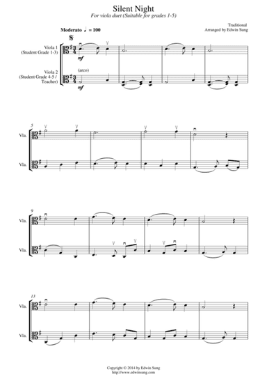 Viola Solo - Level 1 - Digital Download SKU: A0.730969 Composed by Traditional. Arranged by Edwin Sung. Children,Christmas,Classical,Instructional. Individual part. 3 pages. Edwin Sung #3281. Published by Edwin Sung (A0.730969). This duet piece emphasises on teamwork / co-operation, while not setting the bar too high for the players - music appreciation / enjoyment is what all musicians like! Melodies and harmonies do cross over occasionally to gain a balance of roles between the players. That's why this piece is recommended to everyone, ranging from beginners to advanced, to perform professionally or leisurely during Christmas ideally! This product was created by a member of ArrangeMe, Hal Leonard’s global self-publishing community of independent composers, arrangers, and songwriters. ArrangeMe allows for the publication of unique arrangements of both popular titles and original compositions from a wide variety of voices and backgrounds. About Digital Downloads Digital Downloads are downloadable sheet music files that can be viewed directly on your computer, tablet or mobile device. Once you download your digital sheet music, you can view and print it at home, school, or anywhere you want to make music, and you don’t have to be connected to the internet. Just purchase, download and play! PLEASE NOTE: Your Digital Download will have a watermark at the bottom of each page that will include your name, purchase date and number of copies purchased. You are only authorized to print the number of copies that you have purchased. You may not digitally distribute or print more copies than purchased for use (i.e., you may not print or digitally distribute individual copies to friends or students).