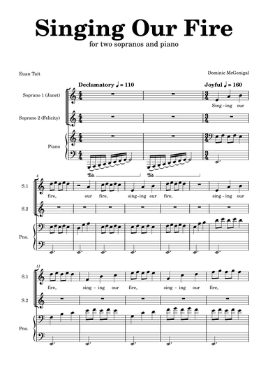 Instrumental Duet,Piano Instrumental Duet,Piano,Soprano voice - Level 3 - Digital Download SKU: A0.1348689 Composed by Dominic McGonigal. 21st Century,Classical,Contemporary. 7 pages. C8 Music #933471. Published by C8 Music (A0.1348689). Singing Our Fire celebrates the beauty of friendship. The two sopranos delight in the sheer joy of their friendship with soaring melodies, cascading scales and glorious harmonies. Euan Tait's poetic words come to life in wonderful exuberance. Singing Our Fire was written for Janet Oates, Felicity Hayward and Toby Carr as part of the Theorbo Today project. Originally written for two sopranos and theorbo, I have arranged it here for two sopranos and piano. Scored for Two Sopranos, Piano. 2'. More at www.dominicmcgonigal.com. This product was created by a member of ArrangeMe, Hal Leonard's global self-publishing community of independent composers, arrangers, and songwriters. ArrangeMe allows for the publication of unique arrangements of popular titles and original compositions from a variety of voices and backgrounds. The length, difficulty, and retail pricing are determined solely by the discretion of the person who arranged or composed it. About Digital Downloads Digital Downloads are downloadable sheet music files that can be viewed directly on your computer, tablet or mobile device. Once you download your digital sheet music, you can view and print it at home, school, or anywhere you want to make music, and you don’t have to be connected to the internet. Just purchase, download and play! PLEASE NOTE: Your Digital Download will have a watermark at the bottom of each page that will include your name, purchase date and number of copies purchased. You are only authorized to print the number of copies that you have purchased. You may not digitally distribute or print more copies than purchased for use (i.e., you may not print or digitally distribute individual copies to friends or students).