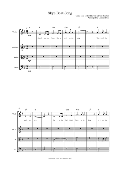 Chamber Orchestra - Level 2 - Digital Download SKU: A0.801749 Composed by William Ross. Arranged by Connie Boss. Celtic,Irish. Score and Parts. 5 pages. Connie Boss #6685933. Published by Connie Boss (A0.801749). This song is in a strings arrangement. It is a Scottish song that was used in the movie Outlander. It is for 2 violins, viola, [email protected] for questions. This product was created by a member of ArrangeMe, Hal Leonard’s global self-publishing community of independent composers, arrangers, and songwriters. ArrangeMe allows for the publication of unique arrangements of both popular titles and original compositions from a wide variety of voices and backgrounds. About Digital Downloads Digital Downloads are downloadable sheet music files that can be viewed directly on your computer, tablet or mobile device. Once you download your digital sheet music, you can view and print it at home, school, or anywhere you want to make music, and you don’t have to be connected to the internet. Just purchase, download and play! PLEASE NOTE: Your Digital Download will have a watermark at the bottom of each page that will include your name, purchase date and number of copies purchased. You are only authorized to print the number of copies that you have purchased. You may not digitally distribute or print more copies than purchased for use (i.e., you may not print or digitally distribute individual copies to friends or students).