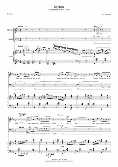 Instrumental Duet Alto Saxophone,Instrumental Duet,Trombone - Level 3 - Digital Download SKU: A0.783511 Composed by Hoagy Carmichael. Arranged by John Groves. Contemporary,Jazz,Standards. Score and parts. 3 pages. John Groves #6272603. Published by John Groves (A0.783511). Skylark - arranged for Alto Sax & Trombone DuetScore Only. This product was created by a member of ArrangeMe, Hal Leonard's global self-publishing community of independent composers, arrangers, and songwriters. ArrangeMe allows for the publication of unique arrangements of popular titles and original compositions from a variety of voices and backgrounds. The length, difficulty, and retail pricing are determined solely by the discretion of the person who arranged or composed it. About Digital Downloads Digital Downloads are downloadable sheet music files that can be viewed directly on your computer, tablet or mobile device. Once you download your digital sheet music, you can view and print it at home, school, or anywhere you want to make music, and you don’t have to be connected to the internet. Just purchase, download and play! PLEASE NOTE: Your Digital Download will have a watermark at the bottom of each page that will include your name, purchase date and number of copies purchased. You are only authorized to print the number of copies that you have purchased. You may not digitally distribute or print more copies than purchased for use (i.e., you may not print or digitally distribute individual copies to friends or students).