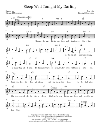 Cello,Double Bass,Drum Set,Electric Bass Guitar,Electric Guitar,Flute,Guitar Accompaniment,Viola,Voice - Level 3 - Digital Download SKU: A0.1296231 By Rick Moose. By Richard Mousseau. Arranged by Richard Mousseau. Children,Contemporary,Folk,Pop,Singer/Songwriter. Full Performance. Duration 209. Moose Hide Music Publishing #886475. Published by Moose Hide Music Publishing (A0.1296231). Pop / Chilldren / Lullaby. New release by Canadian Songwriter. Full score available from publisher. This product was created by a member of ArrangeMe, Hal Leonard’s global self-publishing community of independent composers, arrangers, and songwriters. ArrangeMe allows for the publication of unique arrangements of both popular titles and original compositions from a wide variety of voices and backgrounds. About MP3s at Sheet Music Plus You can now purchase MP3s for download from Sheet Music Plus! You'll find a variety of MP3s from instrumental play alongs to choral accompaniment tracks to great new music from emerging and established artists. After purchase, you can download your MP3 from your Sheet Music Plus Digital Library - no software installation is necessary! You can also listen to your MP3 at any time in your Digital Library.