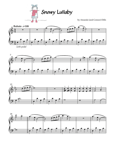 Easy Piano - Level 2 - Digital Download SKU: A0.911690 Composed by Amanda (and Connor) Dills. Arranged by Amanda Dills. Contemporary,Contest,Festival,Holiday,Video Game. Score. 2 pages. Amanda Dills #517673. Published by Amanda Dills (A0.911690). A portrait of a quiet, snowy day for beginning piano. This piece was a mother-son collaboration, written on a snowy February Day. Connor Dills, age 3, "improvised" some accompaniment figures, and his mother, Amanda Dills, added a melody and crafted the overall arrangement. This product was created by a member of ArrangeMe, Hal Leonard’s global self-publishing community of independent composers, arrangers, and songwriters. ArrangeMe allows for the publication of unique arrangements of both popular titles and original compositions from a wide variety of voices and backgrounds. About Digital Downloads Digital Downloads are downloadable sheet music files that can be viewed directly on your computer, tablet or mobile device. Once you download your digital sheet music, you can view and print it at home, school, or anywhere you want to make music, and you don’t have to be connected to the internet. Just purchase, download and play! PLEASE NOTE: Your Digital Download will have a watermark at the bottom of each page that will include your name, purchase date and number of copies purchased. You are only authorized to print the number of copies that you have purchased. You may not digitally distribute or print more copies than purchased for use (i.e., you may not print or digitally distribute individual copies to friends or students).