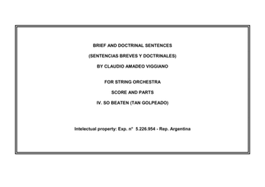 String Orchestra - Level 4 - Digital Download SKU: A0.807867 Composed by Claudio Amadeo Viggiano. 20th Century,Contemporary. Score and parts. 20 pages. Claudio viggiano #5828349. Published by claudio viggiano (A0.807867). "2020 SMP Press Composition Competition - Contemporary Music - Large Instrumental Ensemble"An original composition for string orchestra "BRIEF AND DOCTRINAL SENTENCES (SENTENCIAS BREVES Y DOCTRINALES)", in four movements. Each or the four movement titles are play of words in spanish untranslatable to english. This is 4th movement "SO BEATEN (TAN GOLPEADO)". Includes score and parts. My email contact: [email protected] This product was created by a member of ArrangeMe, Hal Leonard’s global self-publishing community of independent composers, arrangers, and songwriters. ArrangeMe allows for the publication of unique arrangements of both popular titles and original compositions from a wide variety of voices and backgrounds. About Digital Downloads Digital Downloads are downloadable sheet music files that can be viewed directly on your computer, tablet or mobile device. Once you download your digital sheet music, you can view and print it at home, school, or anywhere you want to make music, and you don’t have to be connected to the internet. Just purchase, download and play! PLEASE NOTE: Your Digital Download will have a watermark at the bottom of each page that will include your name, purchase date and number of copies purchased. You are only authorized to print the number of copies that you have purchased. You may not digitally distribute or print more copies than purchased for use (i.e., you may not print or digitally distribute individual copies to friends or students).