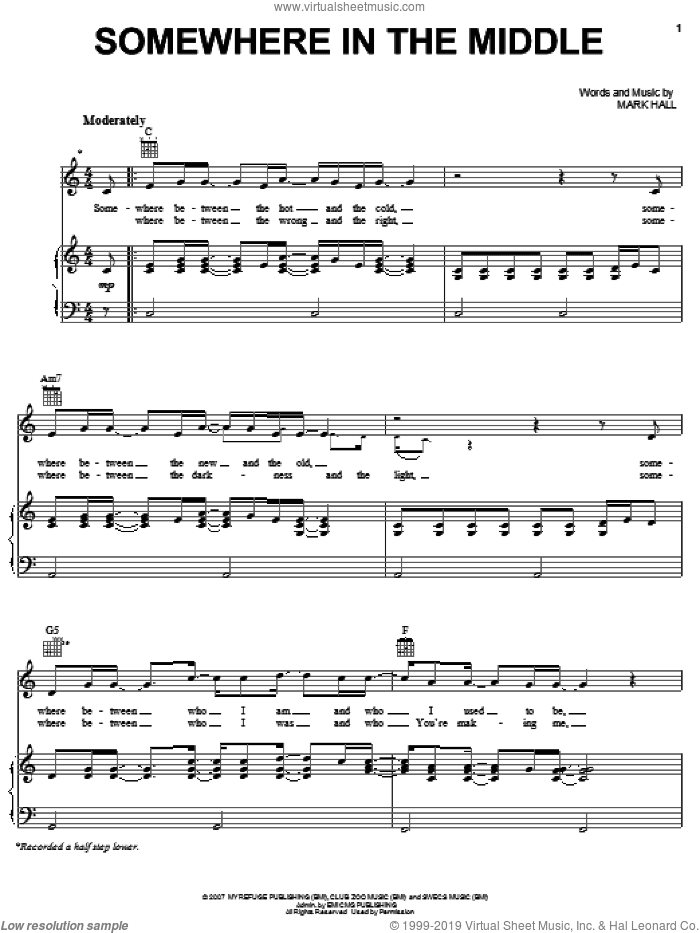Digital sheet music for voice, piano or guitarNOTE: chords, lead sheet indications and lyrics may be included (please, check the first page above before to buy this item to see what's included)Publisher: Hal LeonardContributors to this music title:Mark Hall (writer)This item includes: PDF (digital sheet music to download and print), Interactive Sheet Music (for online playback, transposition and printing). You can transpose this music in any key.Instrumentation:voice, piano or guitarSkill Level:intermediateGenre:christian, pop, rockPages:9